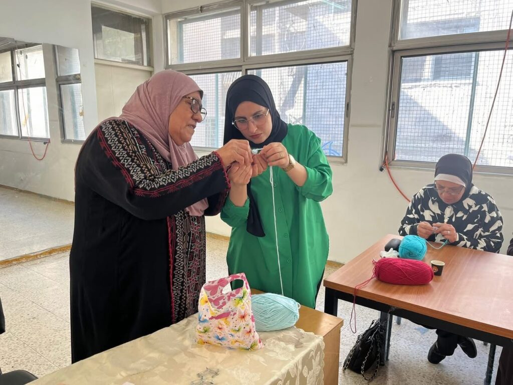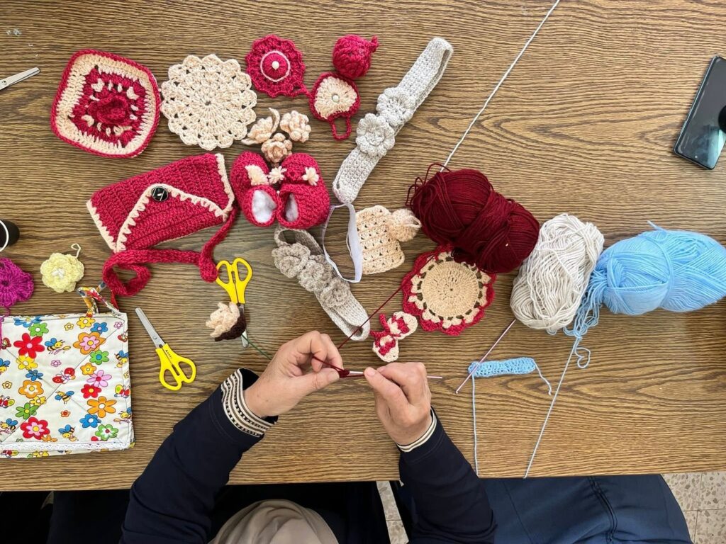 وتجسيداً لمبدأ الاستدامة ونقل الخبرات، تظهر ام عصام العتيق في جمعية النشاط النسوي بمخيم دهيشة وهي تشرف على ورشة تدريبية لتعليم النساء فنون الحياكة والكروشيه. بحيث توثق اللحظات الدقيقة لتعليم كيفية التحكم بالسنارة وتأسيس الغرز الأولى، ضمن مبادرة تهدف إلى تمكين نساء المخيم اقتصادياً وفتح آفاق مهنية جديدة لهن تعتمد على المهارة اليدوية والإبداع الشخصي.