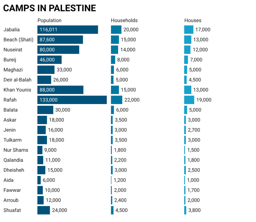 تظهر البيانات المتعلقة بعدد السكان والبيوت في عدد من المخيمات الفلسطينية فجوة واضحة بين الكثافة السكانية والبنية السكنية المتاحة. ففي مخيمات مثل جباليا أو رفح، يعيش مئات الآلاف ضمن مساحات محدودة، مع عدد بيوت لا يتناسب مع هذا الحجم السكاني.